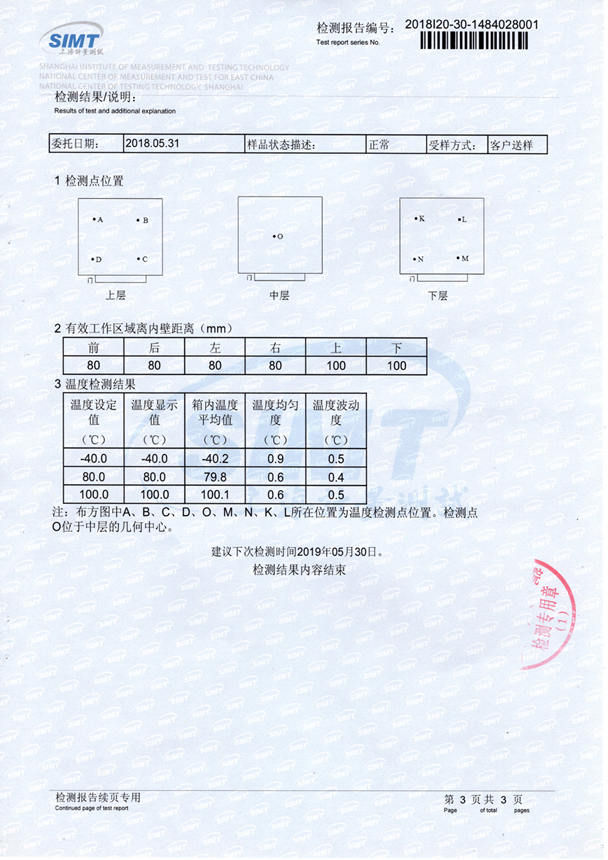 高低溫試驗(yàn)箱在首次投入使用前,應(yīng)對可反映設(shè)備性能的相關(guān)參數(shù)進(jìn)行詳細(xì)確認(rèn)及測試,在日常使用中則應(yīng)依據(jù)所使用的試驗(yàn)方法進(jìn)行對試驗(yàn)參數(shù)的要求,需確認(rèn)其性能是否滿足試驗(yàn)參數(shù)的要求。更多的用戶會(huì)選擇由第三方檢測機(jī)構(gòu)進(jìn)行檢測,并出廠檢測報(bào)告,如下: